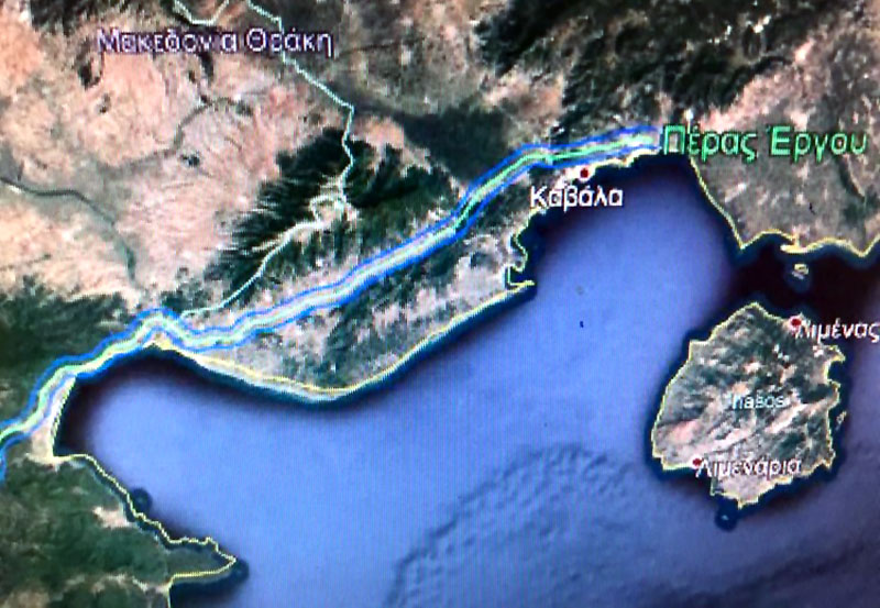 Η χάραξη ως προς το Ν. Καβάλας προβλέπει τα ακόλουθα: Εν συνεχεία με βορειοανατολική πορεία κινείται βόρεια της Εγνατίας Οδού στον κάμπο της Πιέριας κοιλάδας, ανάμεσα στα Όρη Παγγαίο και Σύμβολο (ΠΕ Καβάλας). Περί τη ΧΘ 148+000 εξέρχεται της Πιέριας κοιλάδας και με σήραγγα διέρχεται το Σύμβολον όρος από όπου καταλήγει στο νότιο τμήμα των τεναγών Φιλίππων. Περί τη ΧΘ 162+000 διαμορφώνονται σήραγγες ώστε το έργο να διέλθει βορείως των υψωμάτων της Καβάλας. Το πέρας το έργου διαμορφώνεται στην κάμπο της Νέας Καρβάλης βορειοδυτικά οικισμού.