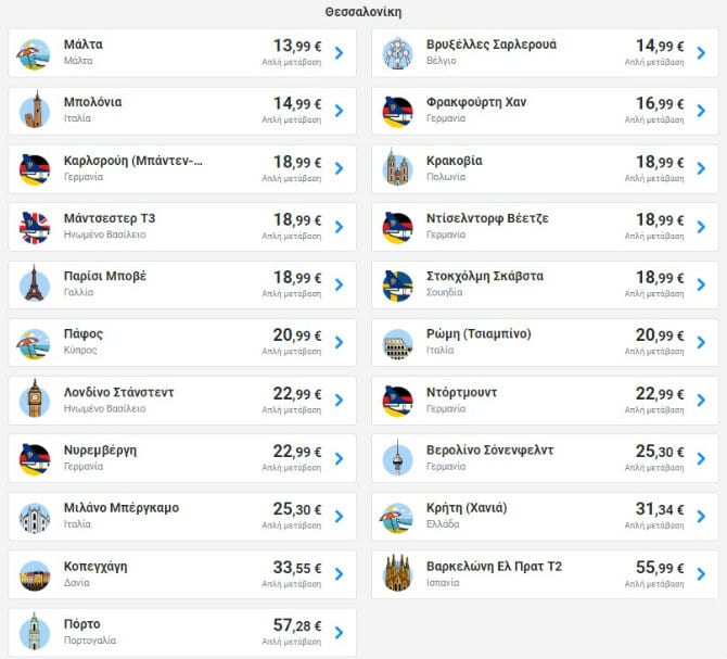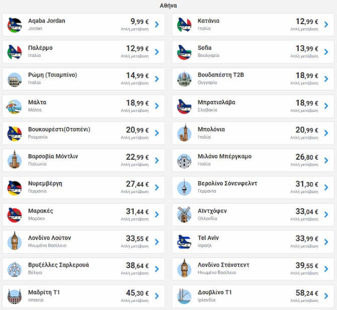 Στον παρακάτω πίνακα βρείτε τον αγαπημένο προορισμό σας και ταξιδέψτε με την Ryanair στις χαμηλότερες τιμές.
