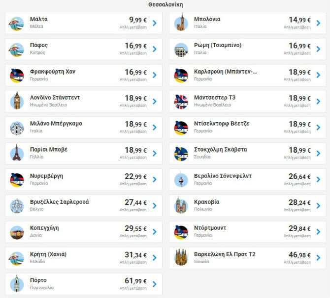 Από την Θεσσαλονίκη, πάλι, έχετε την δυνατότητα να ταξιδέψετε στην Φρανκφούρτη με 16,99€, στο Παρίσι με 18,99€, Βερολίνο με 26,24€ και Κρακοβία με 28,24€.