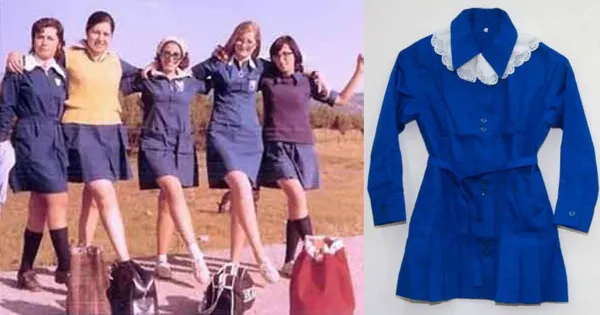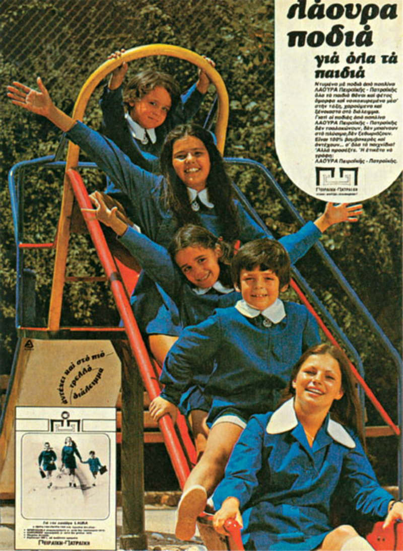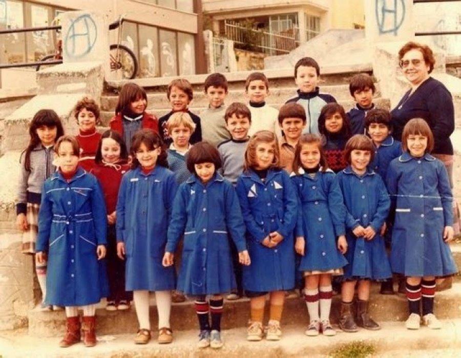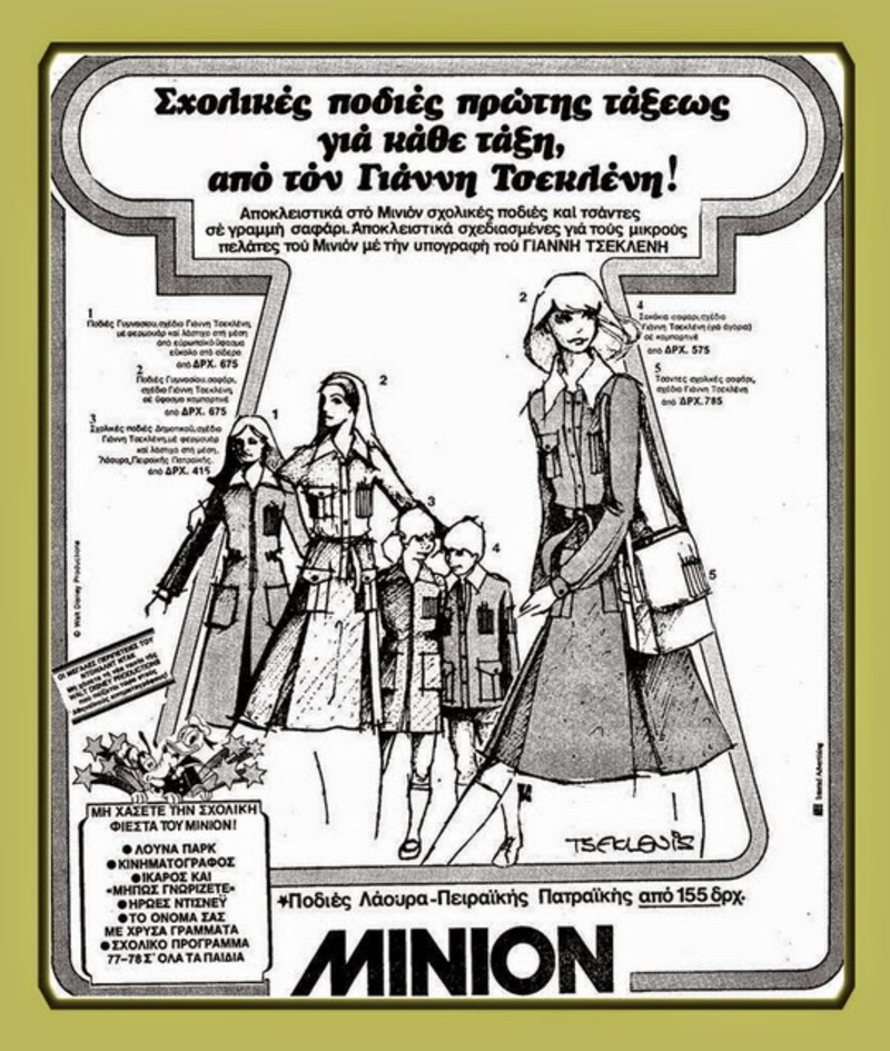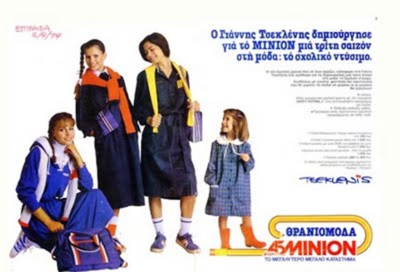 Όταν τα σχολεία έγιναν μικτά, η σχολική ποδιά ίσχυε ακόμη. Ο Τσεκλένης, σχεδιάζοντας τις δικιές του, είχε αναβαθμίσει την υπόθεση και πλέον όλες νομίζαμε ότι είχαμε κάτι από τον αέρα της αεροσυνοδού της Ολυμπιακής, αφού μοιραζόμασταν στολές του ίδιου designer. Συμπληρώναμε δε το look με κοσμήματα, ασορτί καλσόν και πανωφόρια.