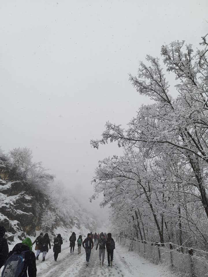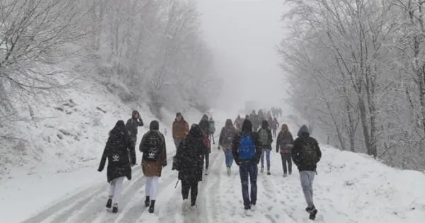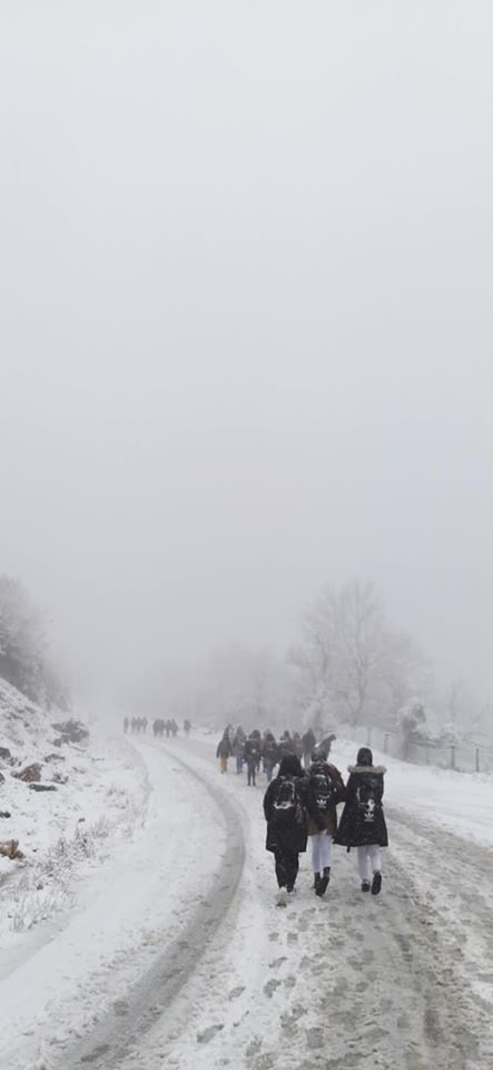 Σε φωτογραφία που αναρτήθηκε στο Διαδίκτυο, μαθητές του Γυμνασίου-Λυκείου Γλαύκης, στα Πομακοχώρια, επιστρέφουν στο χωριό τους Κένταυρο με τα πόδια, καθώς το σχολικό λεωφορείο δεν μπόρεσε να κάνει το δρομολόγιο λόγω χιονιά.