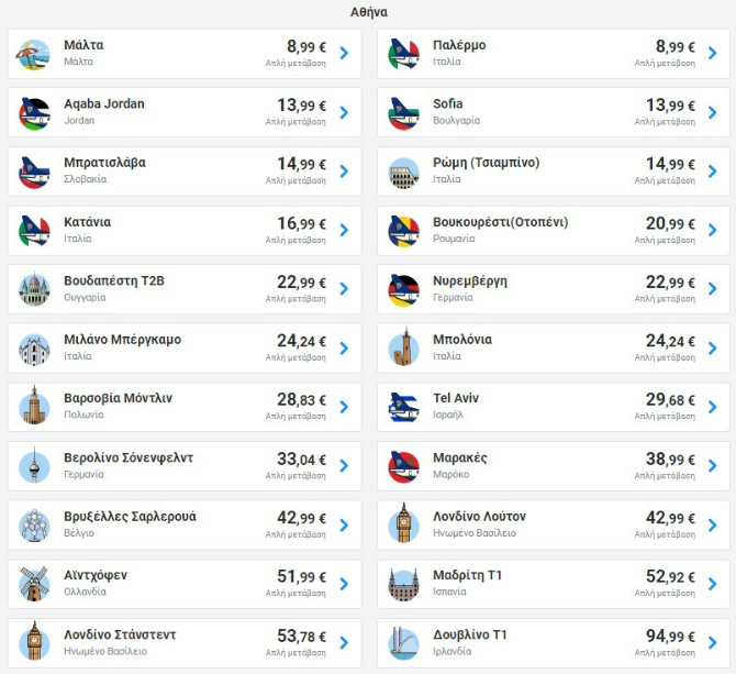 Η χαμηλού κόστους αεροπορική σας ταξιδεύει από Αθήνα προς Μάλτα και Παλέρμο με 8,99€, προς Ρώμη με 14,99€, προς Μιλάνο με 24,24€, ακόμα και προς Βαρσοβία με 28,83€.