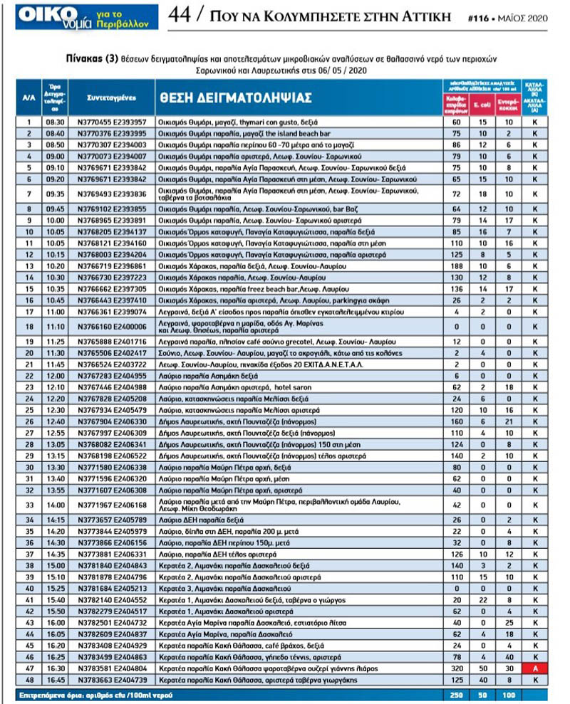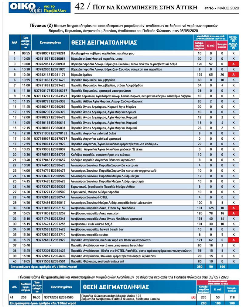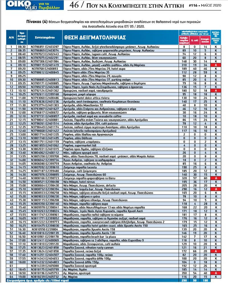 Όπως ενημερώνει το ΠΑΚΟΕ, οι δειγματοληψίες θα συνεχιστούν και σε παραλίες εκτός Αττικής, με τα αποτελέσματα να δημοσιεύονται εντός του Ιουνίου και του Ιουλίου. Οι αναλύσεις δειγματοληψίας και αποτελεσμάτων μικροβιακών αναλύσεων σε θαλασσινό νερό των περιοχών της Ραφήνας, του Μαραθώνα, της Νέας Μάκρης, της Αρτέμιδος και της Ανατολικής Αττικής στις 07/ 05 / 2020. Σύμφωνα με τις αναλύσεις, το 90,63% των παραλιών κρίθηκαν κατάλληλες (συνολικά 58 παραλίες), ενώ το 9,73% κρίθηκε ακατάλληλο (συνολικά 6 παραλίες).