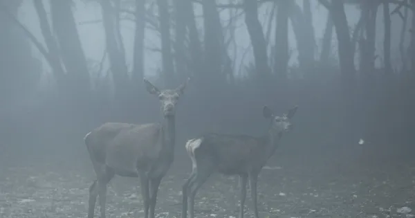 Μία μικρή ομάδα ελαφιών «ποζάρει» στον φωτογραφικό φακό, οι δρόμοι φαίνεται να οδηγούν στο πουθενά και τα ξεραμένα φύλλα δεσπόζουν με φόντο την ομίχλη.