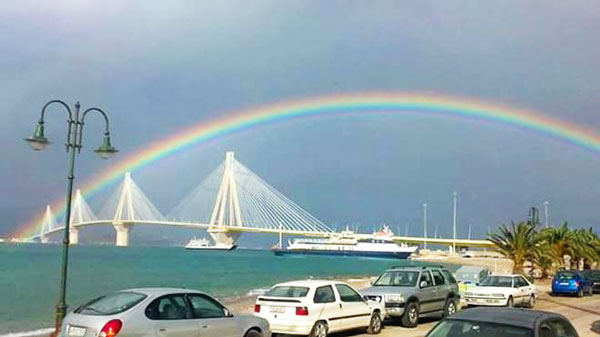 Ένα γιγάντιο ουράνιο τόξο έκανε την εμφάνισή του σε μια σπάνια στιγμή πάνω από την γέφυρα Ρίου-Αντιρρίου