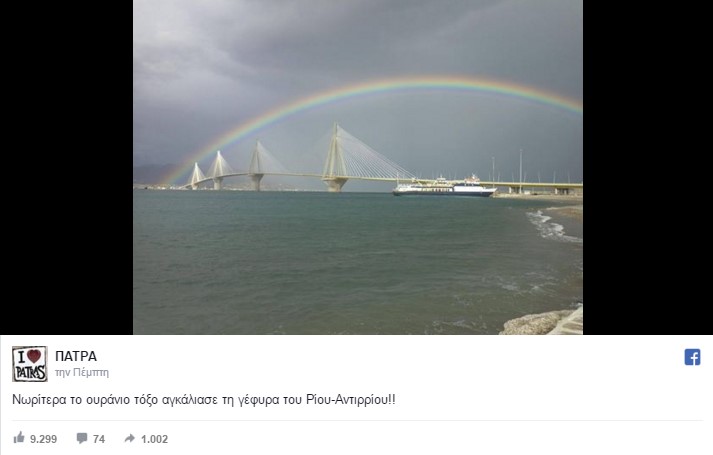 Ειδικότερα, το ουράνιο τόξο μοιάζει να έχει τις βάσεις του στο Ρίο και το Αντίρριο, «ενώνοντας» με την ανεπανάληπτη ομορφιά του τις δύο ακτές του Κορινθιακού.