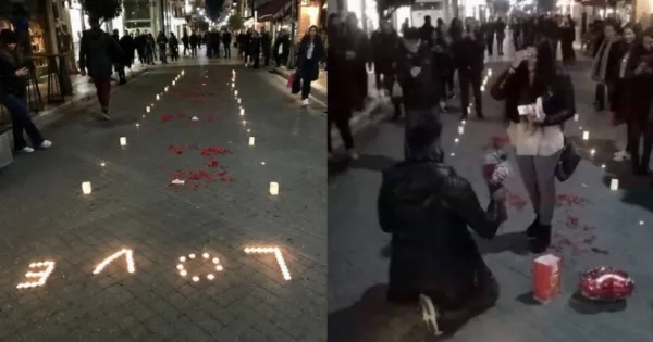 Η κοπέλα εμφανώς συγκινημένη μπροστά στα μάτια όσων περνούσαν από τον πεζόδρομο της Ρήγα Φεραίου στην Πάτρα δεν αντιστάθηκε και είπε το ΝΑΙ στην πρόταση γάμου του αγαπημένου της, υπό τα χειροκροτήματα των συγκεντρωμένων.