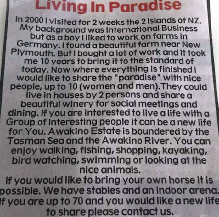 Δέκα ανθρώπους για να ζήσουν μαζί του στον «παράδεισο», το παραθαλάσσιο αγρόκτημά του στη Νέα Ζηλανδία αξίας 5,6 εκατομμυρίων δολαρίων, αναζητεί ο Γερμανός πολυεκατομμυριούχος Karl Reipen, ιδιοκτήτης του κτήματος Awakino Estate, όπως αναφέρουν μέσα ενημέρωσης της Νέας Ζηλανδίας.