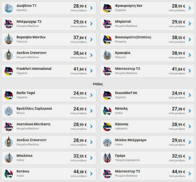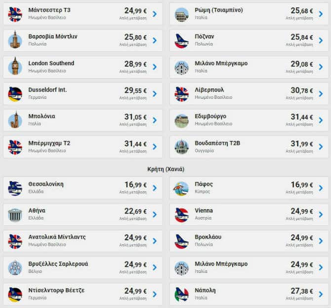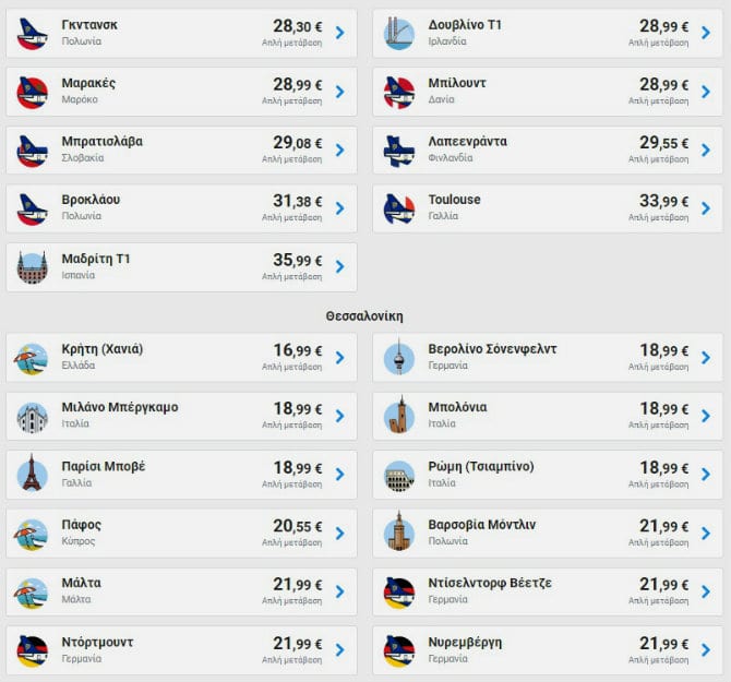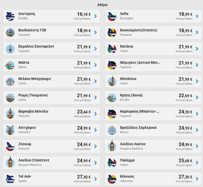 Ενδεικτικά αναφέρουμε πως από Αθήνα μπορείτε να βρείτε εισιτήρια με 16,18€ για Σαντορίνη. Επιπλέον, με 21,99€ μπορείτε να κλείσετε το επόμενο ταξίδι σας για Βερολίνο, Μιλάνο και Ρώμη, με 28,99€ για Δουβλίνο και με 35,99€ για Μαδρίτη.