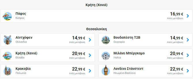 Από Θεσσαλονίκη επωφεληθείτε της προσφοράς ταξιδεύοντας στο Μιλάνο και την Κρακοβία με 20,99€ και 22,99€ αντίστοιχα. Ενώ από Κρήτη, βρείτε εισιτήρια για Πάφο από 16,99€.