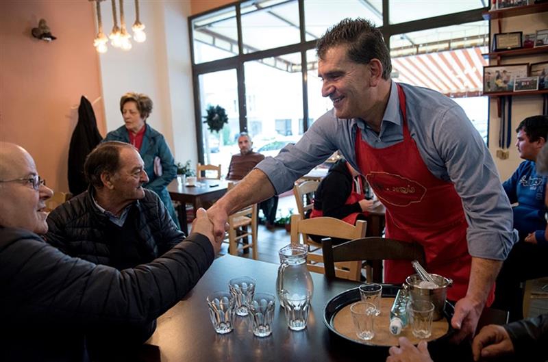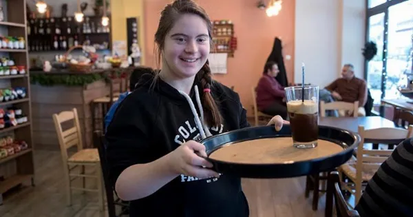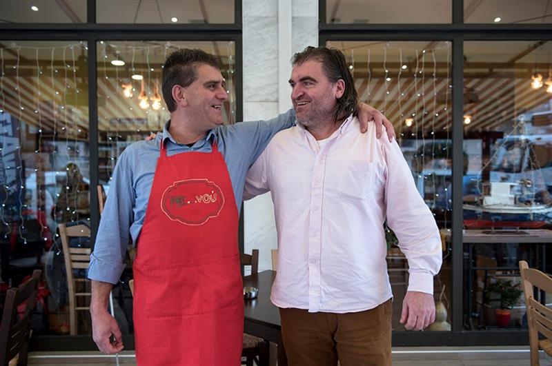 Όταν μπαίνεις, συναντάς έναν ευθυτενή 45άρη να κρατάει με μαεστρία τον δίσκο και να σερβίρει στα λιγοστά τραπέζια. Ο Πασχάλης. Και από πίσω του ένα χαμόγελο να… τρέχει για να συμπληρώνει τις παραγγελίες. Η Μαρία. Στο παντοπωλείο και στους μεζέδες, η Δήμητρα και η Ελισάβετ. Όλοι τους, κάνουν ξεχωριστό το μαγαζί. Με μία λεπτομέρεια: ο Πασχάλης είναι τυφλός και η Μαρία έχει σύνδρομο Down.