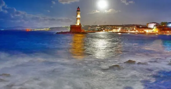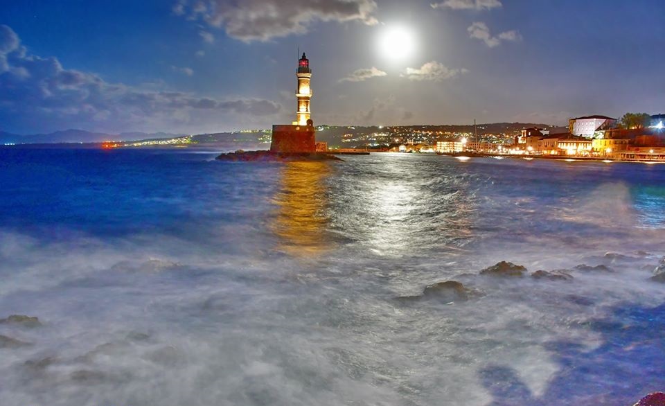 Περίπου στις 20.00 η ελλειπτική τροχιά του έφερε το φεγγάρι πιο κοντά στη Γη παρά τη συννεφιά το εντυπωσιακό φεγγάρι, μεγάλο και λαμπερό, φώτισε κάθε γωνιά του Ενετικού Λιμανικού των Χανίων με τη λάμψη του να σβήνει στο καθρέφτισμα των νερών.