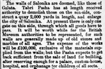 Και ένα άρθρο από Βρετανική εφημερίδα της εποχής, που γκρεμίζονταν τα τείχη, στο οποίο ο συντάκτης θεωρεί σώφρον να στείλει το Βρετανικό Μουσείο απεσταλμένους για να εξετάσουν τα τείχη καθώς θα γκρεμίζονται, γιατί, σύμφωνα με το άρθρο, σε τέτοια τείχη θα μπορούσε κάποιος να βρει αγάλματα και άλλα αρχαία παλαιών εποχών (Facebook: Γιώργος Μπασαγιάννης)