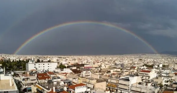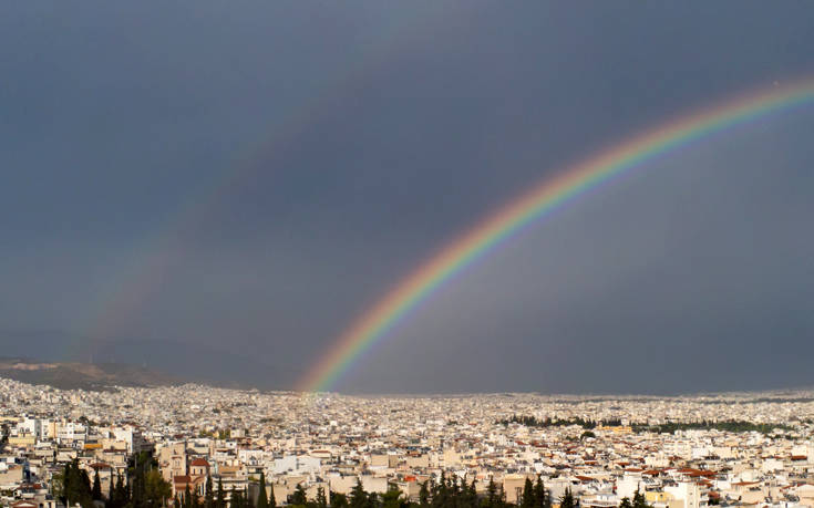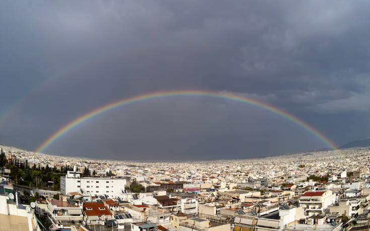 Ο ουρανός της Αθήνας μαύρισε το απόγευμα της Πέμπτης και ισχυρές βροχές ξέσπασαν σε πολλές περιοχές της Αττικής. Ένα όμορφο ουράνιο τόξο έκανε την εμφάνισή του στον ουρανό, με το τοπίο να θυμίζει για πρώτη φορά έντονα φθινόπωρο.