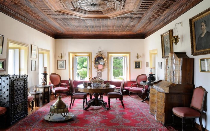 Ξεχωρίζουν η νυφική βενετσιάνικη κασέλα. Ένα γαλλικό επίχρυσο ρολόι με πορσελάνη Sevres, γαλλικές μινιατούρες, κεντήματα, τσεβρέδες, χάρτες, αφιερώματα και ελαιογραφίες εποχής.