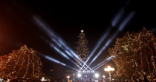 Το φυσικό χριστουγεννιάτικο δέντρο, ύψους 33 μέτρων που δεσπόζει στο κέντρο της πόλης, στην πλατεία Ηρώων Πολυτεχνείου, στολίστηκε με λαμπιόνια και γιρλάντες ενώ όλο το πάρκο έχει φωτιστεί σε εορταστικούς τόνους.