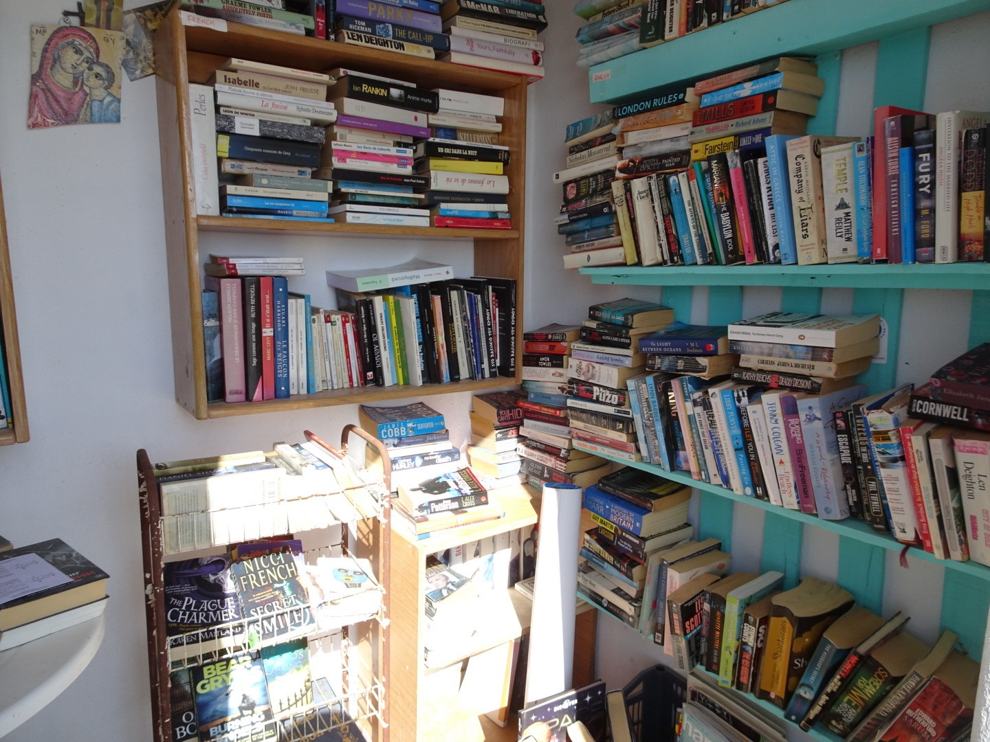 Πέρα από τη βιβλιοθήκη με τίτλους στα Ελληνικά και τα Αγγλικά, μία καρέκλα και ένα τραπέζι κάνουν την αναμονή για το επόμενο λεωφορείο πολύ πιο ενδιαφέρουσα.