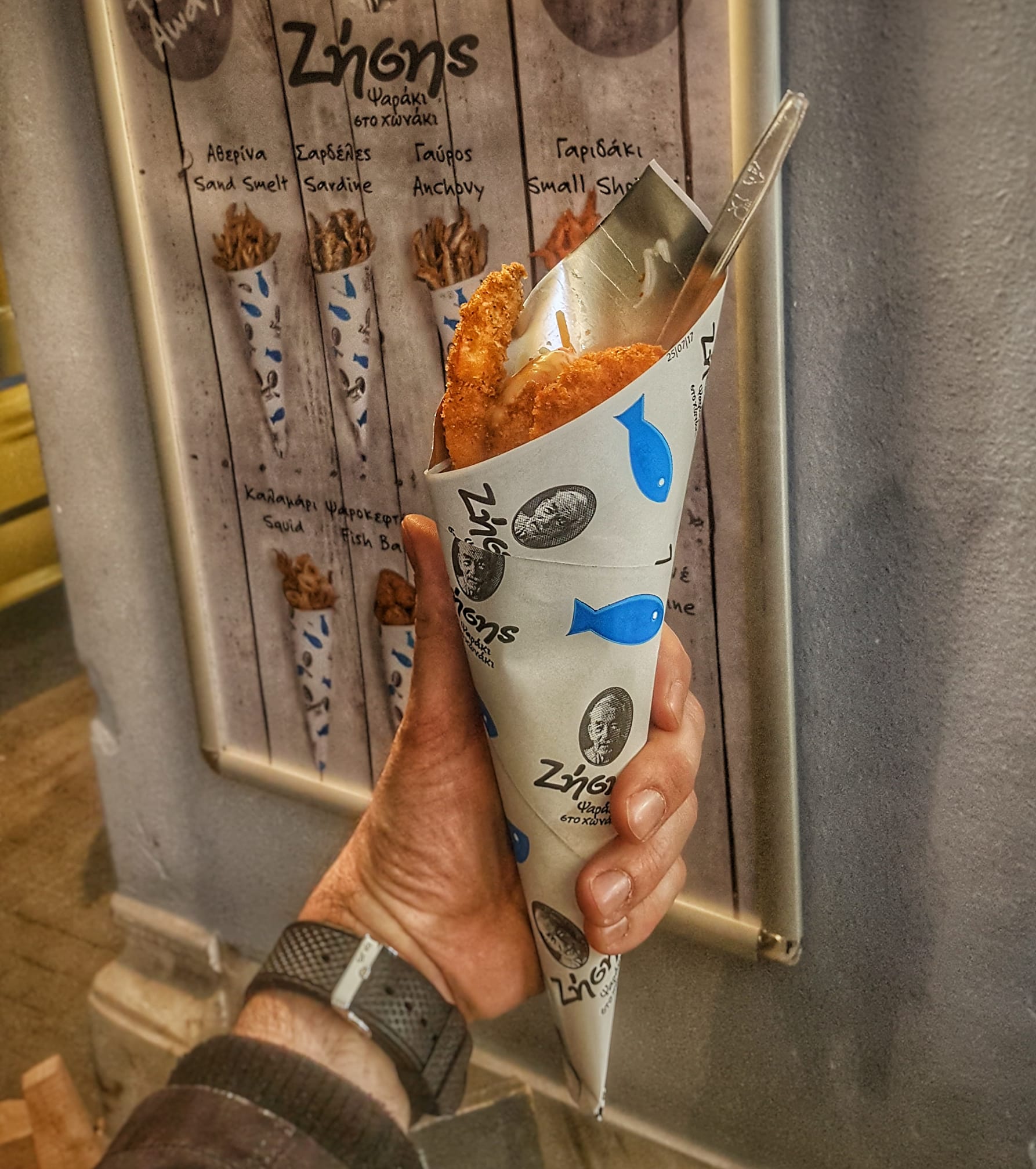 Στο χωνάκι τώρα μπορείτε να πάρετε ψαράκια και θαλασσινά, όπως γαύρο, αθερίνα, μαρίδα, κροκέτες μπακαλιάρου με κουρκούτι, καλαμαράκιααλλά και ψιλή γαριδούλα (και με ελαφρώς πικάντικη σάλτσα horseradish), σος ταρτάρ ή λαδολέμονο.
