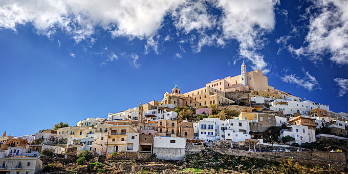 Ένα υπαίθριο μουσείο, με αέρα κοσμοπολίτικο, ρομαντικό και μποέμ, που πηγάζει από τα αρχοντικά του 19ου αιώνα, τα νεοκλασικά κτίρια και τις κυκλαδίτικες πινελιές, τα δρομάκια που σκαρφαλώνουν στους δύο της λόφους και τα αρχοντικά εφοπλιστών αλλοτινών καιρών. Οι βόλτες ξεκινούν από την πλατεία Μιαούλη με το πανέμορφο δημαρχείο διά χειρός Τσίλερ, περνούν από το αρχαιολογικό μουσείο και το περίτεχνο θέατρο Απόλλων και συνεχίζονται σε μία κουκλίστικη συνοικία…