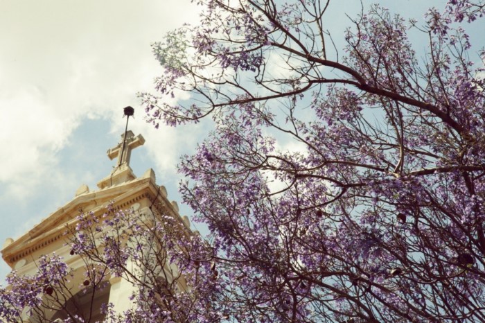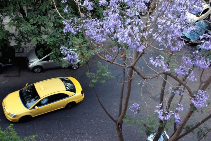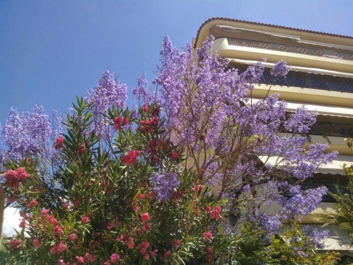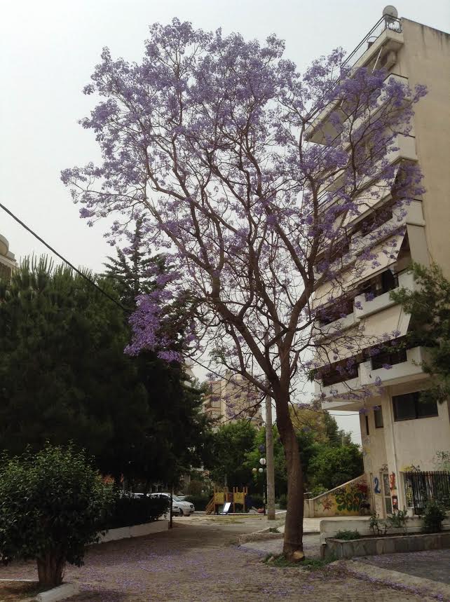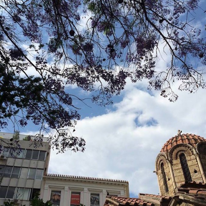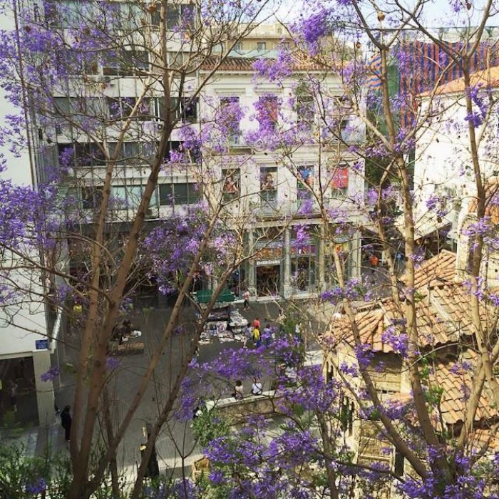 Ακόμα κι εδώ όμως, στην οδό Αθηνάς, στην Καπνικαρέα και στην Αγία Ειρήνη, μια τζακαράντα ανθισμένη μπροστά από κτίρια νεοκλασικά μπορεί να σου μεταδώσει ένα αίσθημα γαλήνης και χαράς.
