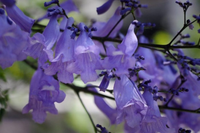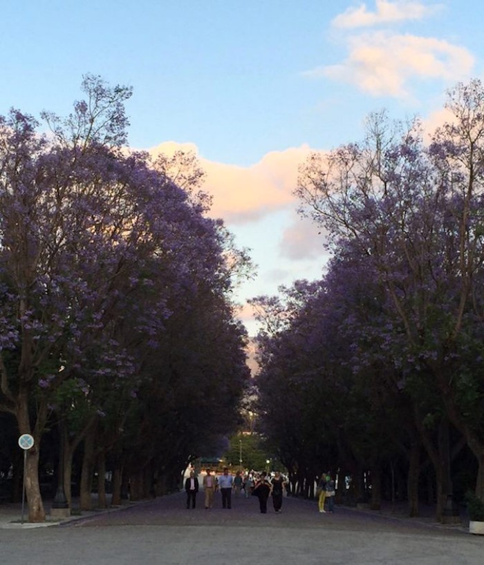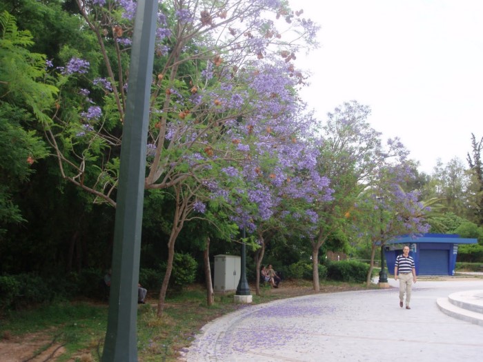 Γιατί κάτω από το θόλο που δημιουργούν με τα απλωμένα κλαδιά τους τα πανύψηλα δέντρα που είναι φυτεμένα στις δύο πλευρές του δρόμου, απλώνεται ένα χαλί από λεπτεπίλεπτες μπλε μωβ τρομπέτες με φίνο άρωμα που διαχέεται στον αέρα και η μαγεία του σε αιχμαλωτίζει.