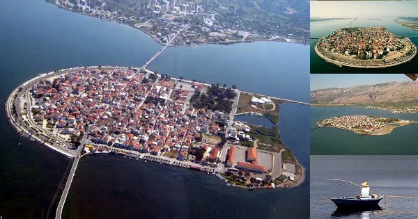 Στην μέση μιάς λιμνοθάλασσας, «αναβλύζει» ένα μικρό νησάκι, που ενώνεται με δύο τοξωτές γέφυρες, μήκους 300 μέτρων, ανατολικά, και δυτικά.