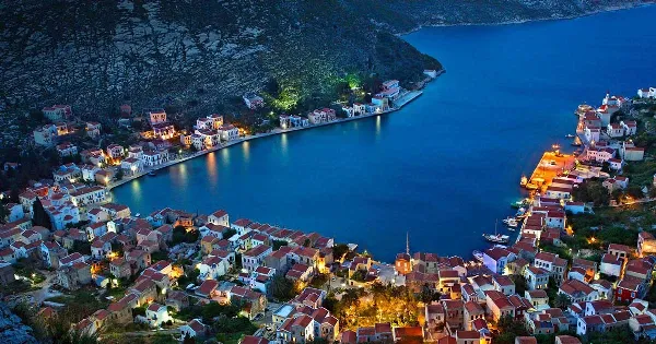 Από το ίδιο σημείο το βράδυ, στο τραπεζάκι με το χάρτινο τραπεζομάντιλο, την ώρα του απλού δείπνου, σα λαμπερά βεγγαλικά τα πορτοκαλιά φώτα της Τουρκίας απέναντι δίνουν μια νότα χλιδής στη ζεστή νησιώτικη νύχτα.