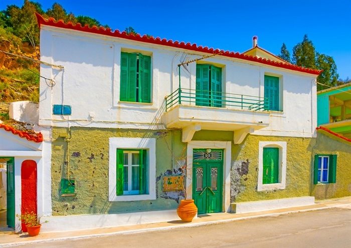 Γυρίστε, όμως, πίσω στο λιμάνι με τα πόδια. Πρώτον, είναι πολύ ωραία βόλτα και, δεύτερον, σας δίνει μια καλή αίσθηση του νησιού. Στο δρόμο θα συναντήσετε τη Γαλήνη, ένα πανέμορφο πέτρινο αρχοντικό στο χρώμα της πορφύρας. Με τα παραθυρόφυλλά της κλειστά, δίνει την εντύπωση ότι κοιμάται σαν μια ωραία κοιμωμένη.