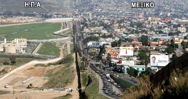 Tα σύνορα μεταξύ των Ηνωμένων Πολιτειών (αριστερά) και του Μεξικού (δεξιά)