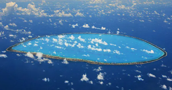 Το σχήμα του μοιάζει με έναν τεράστιο δακτύλιο, σχηματισμένος αποκλειστικά από κοράλλια.