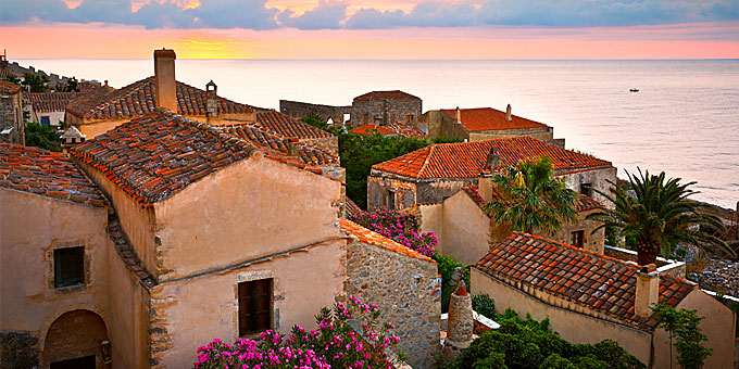 …με τα ευωδιαστά λουλούδια να σκεπάζουν τις δρομικές, ήτοι τα θολωτά μονοπάτια της μεσαιωνικής καστροπολιτείας που ατενίζει το Μυρτώο και τις «βόλτες», τα φιδογυριστά δρομάκια που ανηφορίζουν ως την εγκαταλελειμμένη Άνω Πόλη για ακόμα καλύτερη θέα.