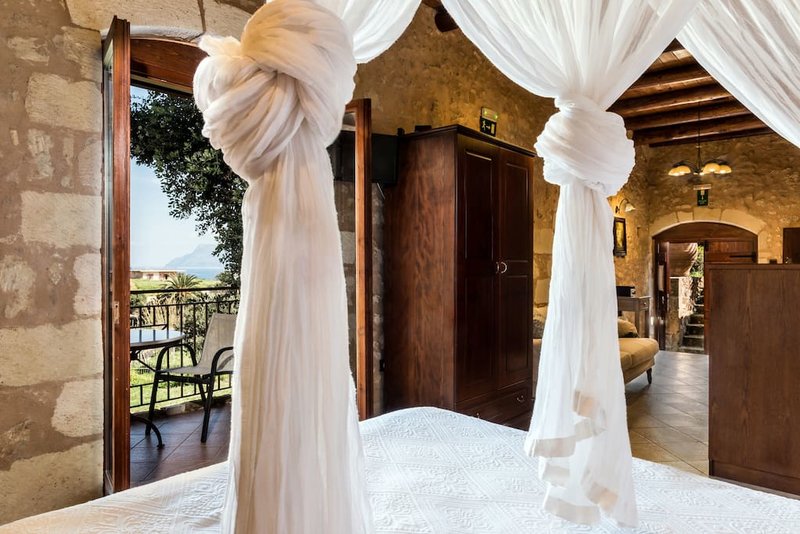 Πέρα από την φυσική σπηλιά που «απλώνεται» πάνω από την κουζίνα και πίσω από την κρεβατοκάμαρα, εντυπωσιακό είναι και το μπαλκόνι του στούντιο, το οποίο έχει θέα θάλασσα και συγκεκριμένα το κόλπο του Κίσσαμου, ενώ στο βάθος απλώνονται βουνά.
