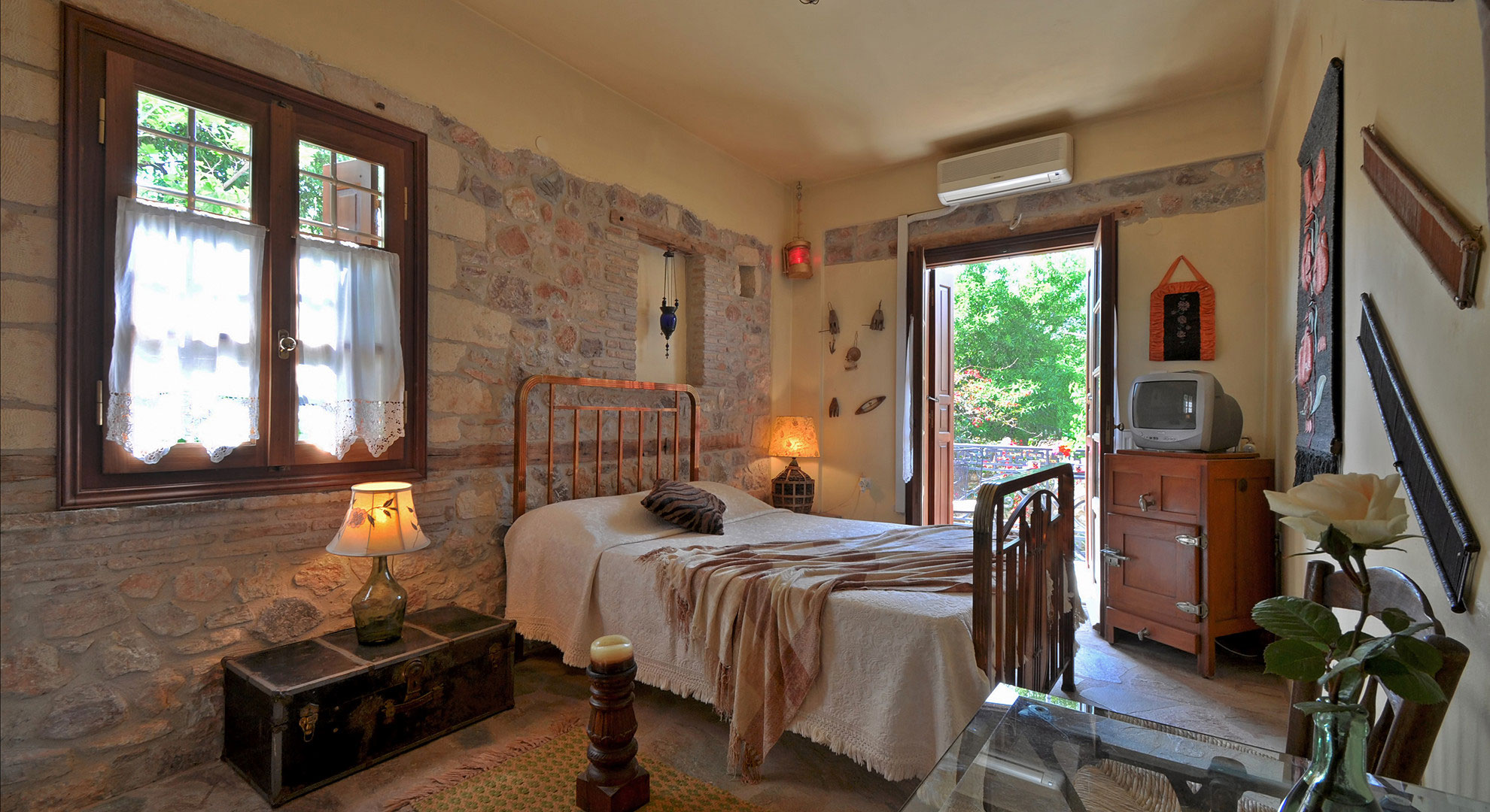 Μαζί του γλυκό του κουταλιού από τη Ρωξάνη Λημνιού, φωτογραφίες προγόνων, όμορφα πλεκτά με βελονάκι, ζωγραφισμένες από τον σύζυγό της Αρη καμάρες παραθύρων, πέρασμα στην αρχοντιά και στη γοητεία μιας άλλης εποχής.