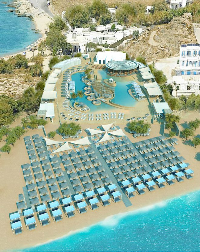 Ο λόγος για την εγκατάσταση SantAnna στην παραλία της Παράγκας στην Μύκονο. Πρόκειται για ένα συγκρότημα συνολικής επιφάνειας 10.000 τ.μ. που διατηρεί την κυκλαδίτικη αρχιτεκτονική.