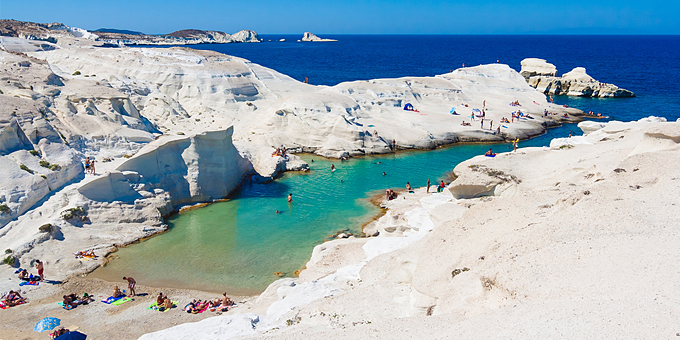 Ολόλευκα βράχια που «καθρεφτίζουν» το κυκλαδίτικο φως. Λωρίδες χρυσαφένιας άμμου ανάμεσά τους. Καταγάλανα νερά με απόκοσμες σπηλιές για φόντο. Αυτό είναι το σεληνιακό τοπίο που έκανε πασίγνωστη τη Μήλο σε όλο τον κόσμο, και γίνεται ακόμα πιο μαγικό τα φεγγαρόλουστα βράδια, όταν το φως της σελήνης αντανακλάται στα κατάλευκα βράχια –βραδινό μπάνιο, κανείς;