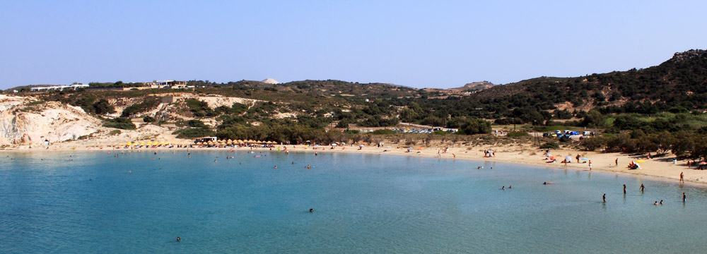 Η μεγαλύτερη παραλία του νησιού έχει ανοιχτόχρωμη, χρυσαφένια άμμο, γαλαζοπράσινα νερά να τα πιεις στο ποτήρι και απίστευτα πολλά κοχύλια. Είναι, στην πραγματικότητα, δύο παραλίες: Μία οργανωμένη με beach bar και water sports (οι λάτρεις του surf θα βρείτε εδώ τον παράδεισό σας) και μία πιο ήσυχη ακριβώς δίπλα της.