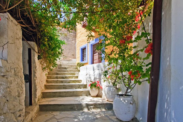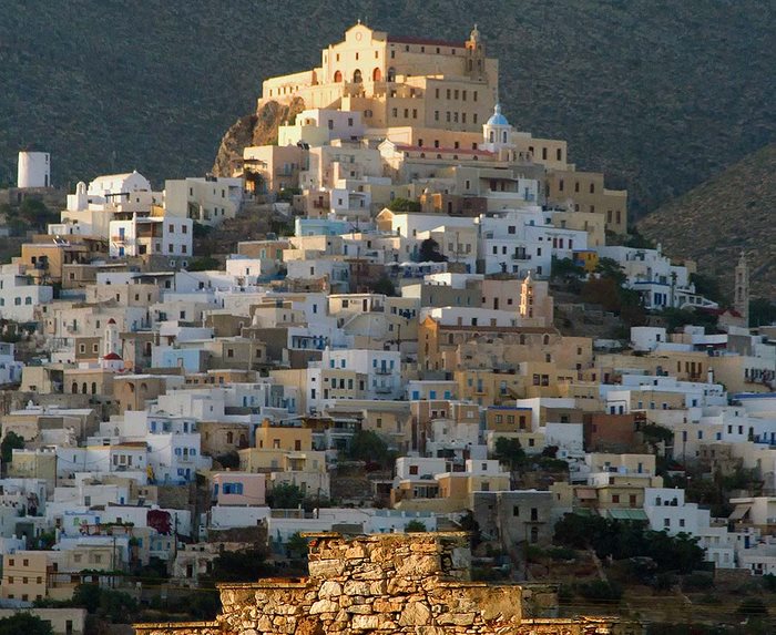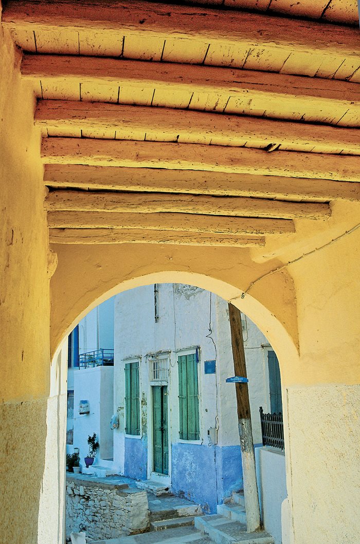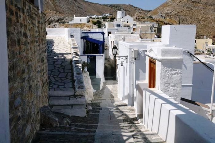 Από εδώ ο μεσαιωνικός κυκλαδικός οικισμός με τη σφιχτά δομημένη ρυμοτομία του, μοιάζει να κατρακυλά στη ράχη του λόφου. Ασφάλτινοι δρόμοι τον προσεγγίζουν από τρία σημεία όπου παλιά ήταν οι τρεις από τις συνολικά επτά πύλες της οχυρωμένης πόλης. Εκεί κοντά στις πορτάρες, διακρίνει κανείς τμήμα του τείχους που σχηματίζουν τα σφιχταγκαλιασμένα σπίτια, χαρακτηριστικό γνώρισμα κάθε μεσαιωνικού οικισμού.