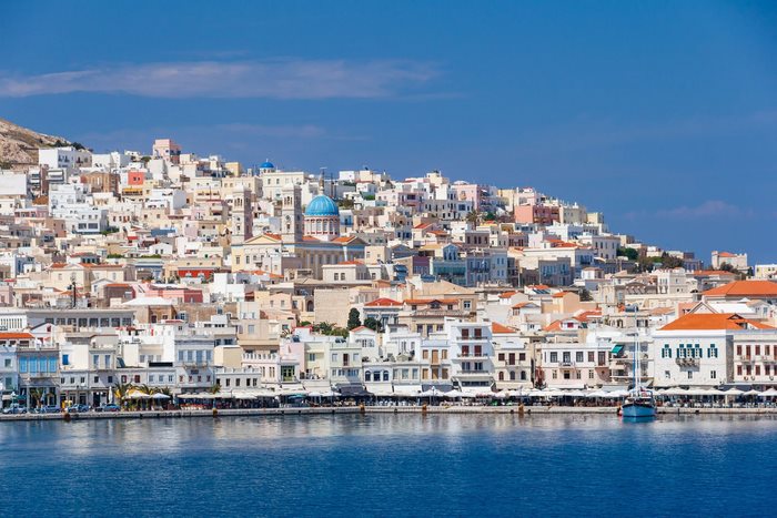 Καθώς το πλοίο μανουβράρει στο λιμάνι, έχεις την ευκαιρία να ανιχνεύσεις το νησιωτικό τοπίο. Θα χαζέψεις την πολυσύχναστη προκυμαία, τα μεγαλόπρεπα νεοκλασικά κτίρια ψηλότερα, τη γειτονιά της Ανάστασης και την αντικρινή πολιτεία της Ανω Σύρας με το κυκλαδικό ταμπεραμέντο να στεφανώνει την κορφή του λόφου.