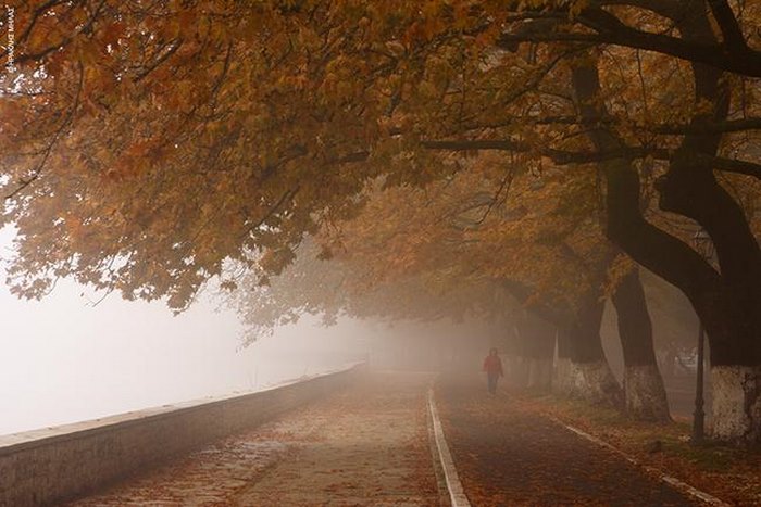 Ομίχλη πυκνή που κατακάθεται πάνω από τη λίμνη κάθε χειμωνιάτικο πρωινό. Ο ουρανός θέλει να σε πλακώσει, είναι προφανές. Δεν έχεις αντίρρηση. Οι κορμοράνοι μοιάζουν με κοράκια, οι νησιώτες στις πλάβες με περαματάρηδες που θέλουν να σε περάσουν στην αντίπερα όχθη κι οι περαστικοί με τις κουκούλες και τα ασαφή περιγράμματα με αλλόκοτες μορφές άλλου κόσμου. Δεν τρομάζεις, έχεις ρόλο στο παραμύθι και σ’ αρέσει. Σ’ αρέσει πολύ!