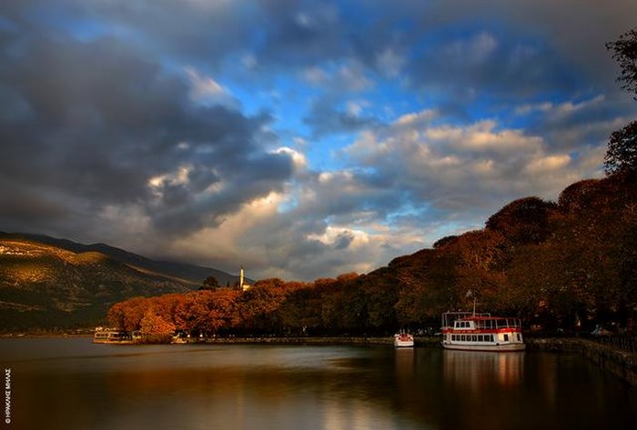 Τι χρώμα έχει η λίμνη; Γαλάζιο, πράσινο, άσπρο, μαύρο, πορτοκαλί, ροζ, μοβ. Ολα τα χρώματα της ίριδας και όλες οι αναμείξεις τους αντανακλώνται πάνω στα πότε ακύμαντα, πότε ρυτιδιασμένα νερά της. «Η λίμνη των Ιωαννίνων ή αλλιώς λίμνη Παμβώτιδα, έχει έκταση 23 τετραγωνικά χιλιόμετρα, βάθος 13 μέτρα και περίμετρο 33 χιλιόμετρα» αναφέρουν οι επίσημες πηγές. Ποια Παμβώτιδα και ποια Ιωαννίνων; Είναι η Λίμνη, σκέτο και με το «λ» κεφαλαίο. Οπως και το νησί των 0,3 τετραγωνικών χλμ. μέσα της, το ένα από τα δύο κατοικημένα της Ελλάδας, απλά το Νησάκι!