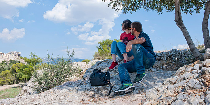 Στους διαδοχικούς λόφους των Νυμφών, των Μουσών και της Πνύκας, που η συντριπτική πλειοψηφία των Αθηναίων αποκαλούμε συνοπτικά «του Φιλοπάππου». Ναι, στην πραγματικότητα οι λόφοι είναι τρεις, δεν είναι ένας, και οι (πλακόστρωτες και χωμάτινες) διαδρομές που τους ανεβοκατεβαίνουν είναι τόσο πολλές που αποκλείεται να τις έχεις περπατήσει όλες.