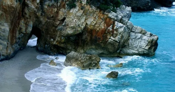 Στην παραλία τα δύο τμήματά του ενώνονται από ένα άνοιγμα στο βράχο που επιτρέπει την πρόσβαση από το ένα τμήμα στο άλλο.