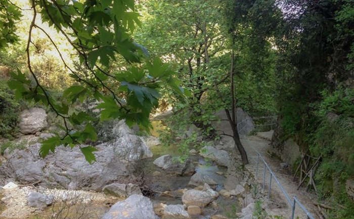 Η πυκνή βλάστηση, τα πλατάνια, τα τρεχούμενα νερά και οι λιμνούλες ανάμεσα στους βράχους συνθέτουν μια όαση πρασίνου και δροσιάς.