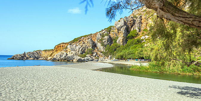 Ένα ποτάμι που διασχίζει ένα φοινικόδασος, σχηματίζοντας μικρές λιμνούλες και καταρρακτάκια στα οποία μπορείτε να βουτήξετε, πριν καταλήξει σε μια από τις ωραιότερες παραλίες της Κρήτης –αν όχι του κόσμου ολόκληρου.