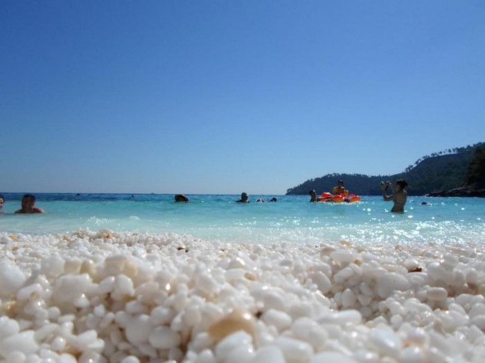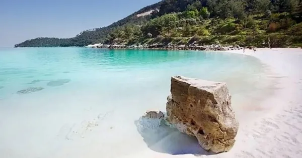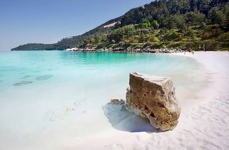 Η ψιλή άσπρη άμμος που λαμπυρίζει και τα φανταστικά τυρκουάζ νερά της παραπέμπουν σε εξωτικές παραλίες της Καραϊβικής και του Ειρηνικού.