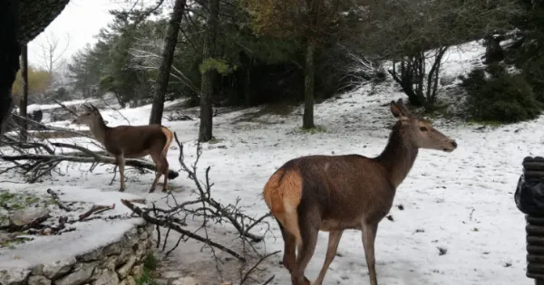Ομορφες εικόνες από τη χιονισμένη Πάρνηθα με τα ελάφια να απολαμβάνουν τη χιονόπτωση…