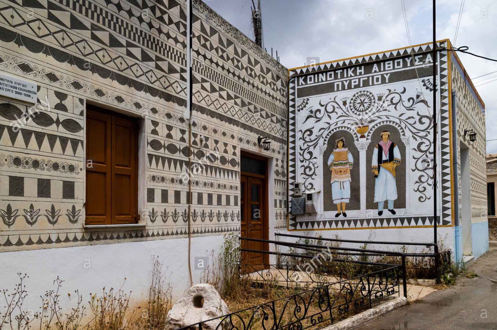 Στενοί, πέτρινοι δρόμοι, ο ναός των Αγίων Αποστόλων, που χρονολογείται από τον 13ο αιώνα, πλήθος άλλων εκκλησιών αλλά κυρίως η γεωμετρική διακόσμηση των εξωτερικών τοίχων των σπιτιών, κάνουν το Πυργί πραγματικά μοναδικό.
