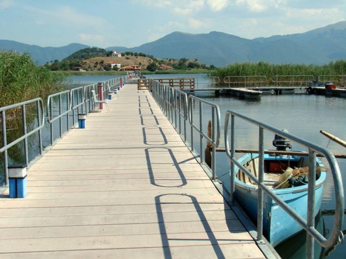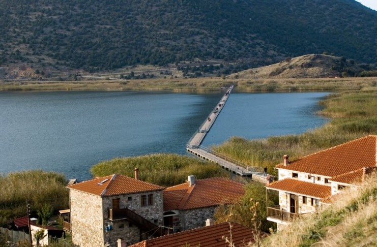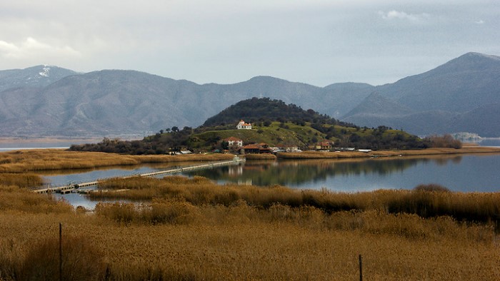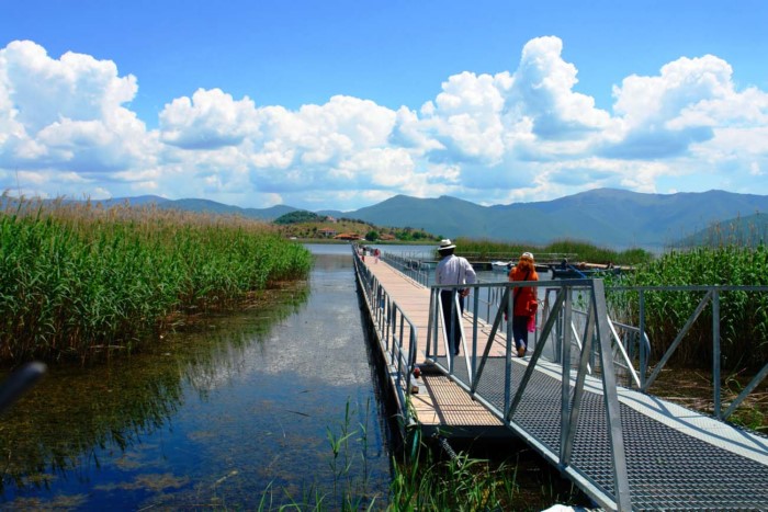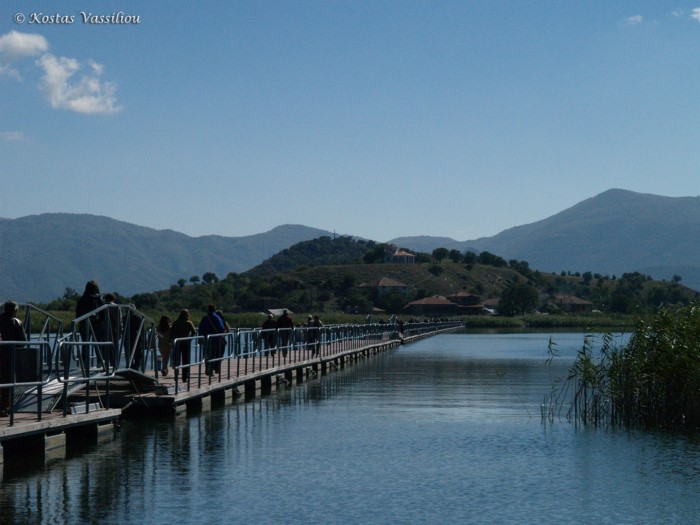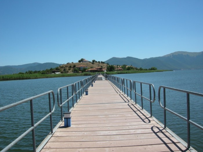 Ο Άγιος Αχίλλειος, ένα μικροσκοπικό νησάκι μέσα στη Μικρή Πρέσπα που συνδέεται με την ξηρά με μια πλωτή πεζογέφυρα μήκους 650 μέτρων. Περπατάς ανάμεσα σε καλάμια ψηλά, κι αν είσαι τυχερός θα δεις πελεκάνους και πουλιά να προσγειώνονται στο νερό δίπλα σου.