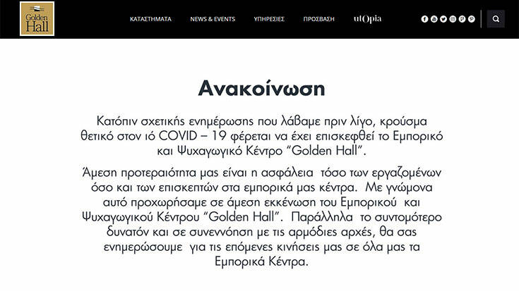 «Κατόπιν σχετικής ενημέρωσης που λάβαμε πριν λίγο, κρούσμα θετικό στον ιό COVID-19 φέρεται να έχει επισκεφθεί το Εμπορικό και Ψυχαγωγικό Κέντρο Golden Hall.