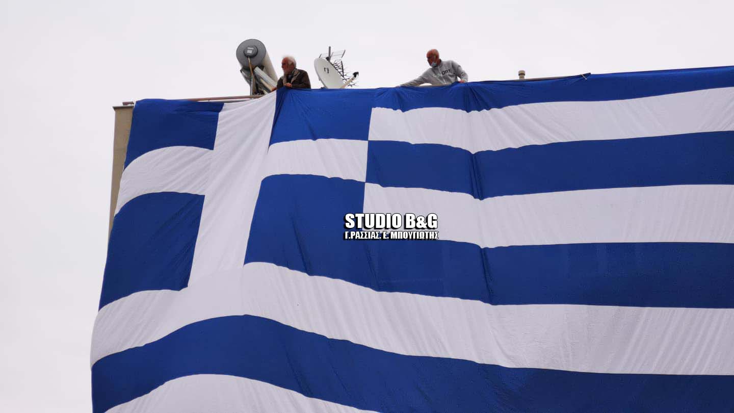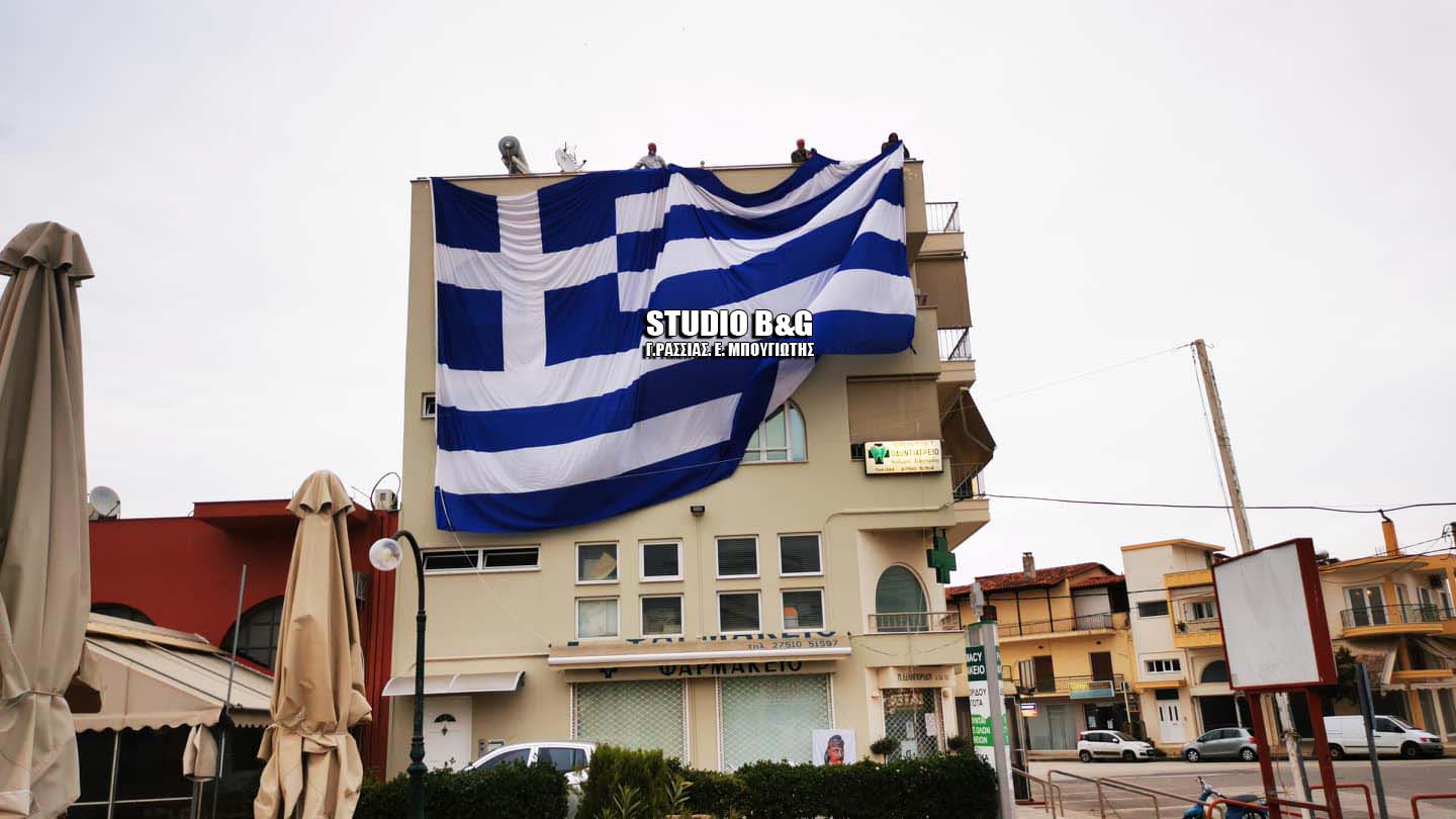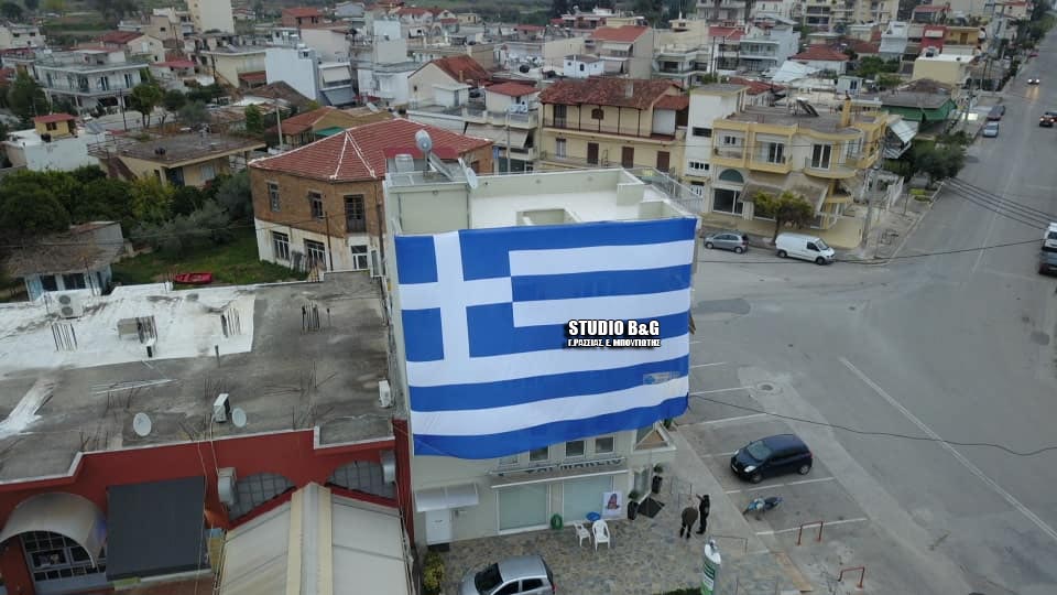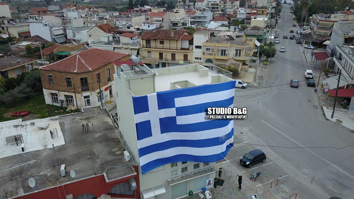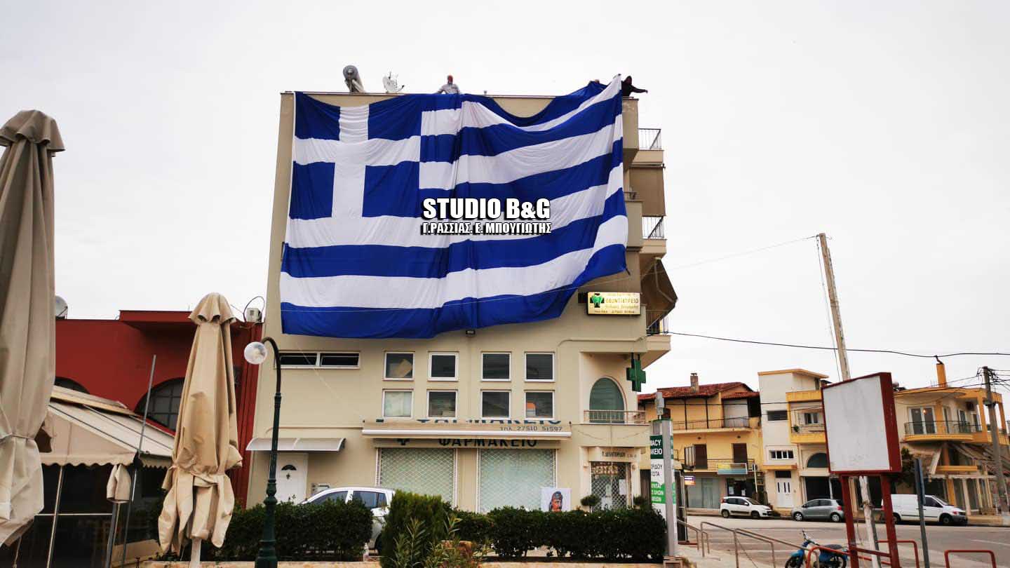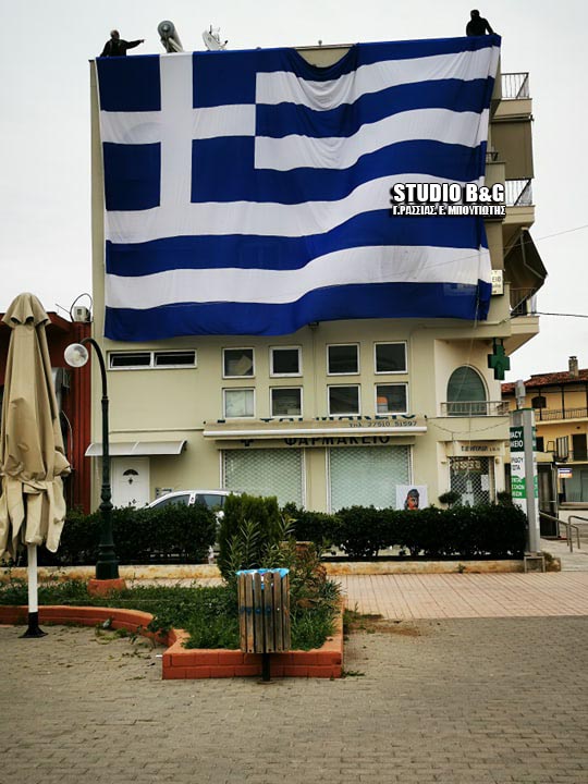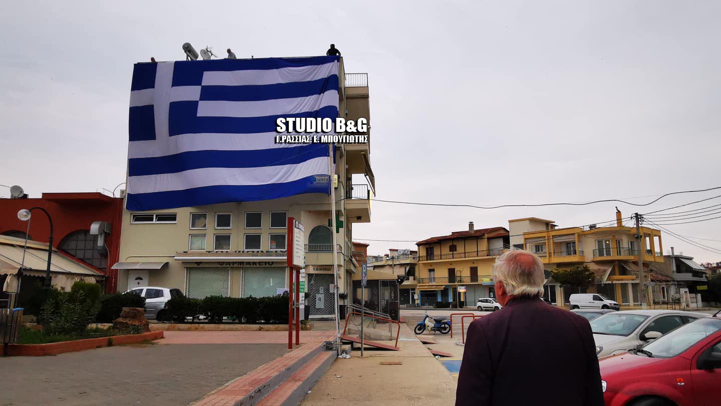 Συγκεκριμένα στην πλατεία της Νέας Κίου ο Αντιδήμαρχος Άργους Μυκηνών Γιάννης Αθανασόπουλος επιμελήθηκε την ανάρτηση σε κεντρικό κτίριο μιας τεράστιας Ελληνικής σημαίας 140 τ.μ. όπως κάνει παραμονές, σε κάθε Εθνική επέτειο τα τελευταία χρόνια.